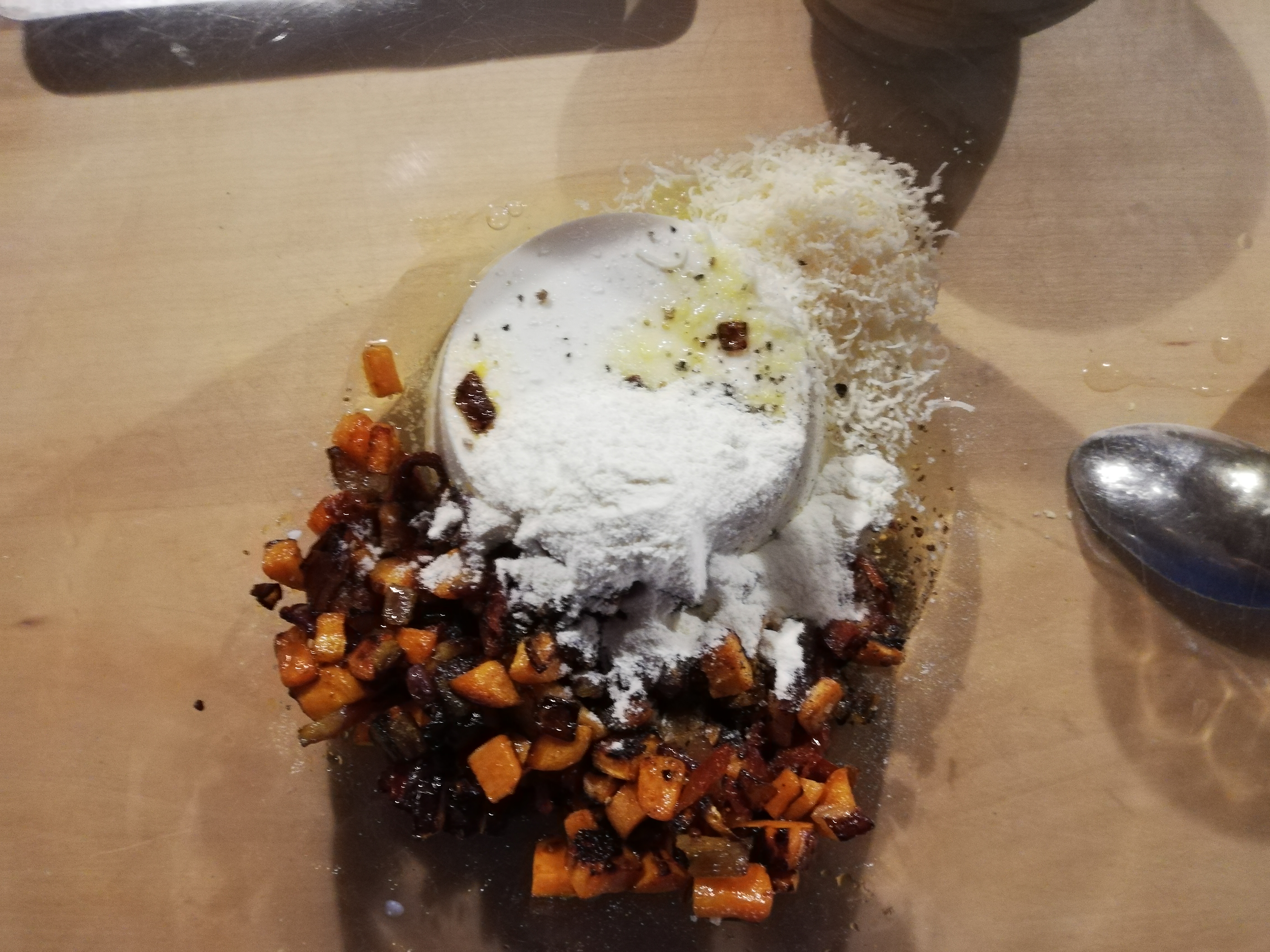 Mix everything in a bowl with the ricotta, egg white, salt, pepper, a spoonful of grated cheese, a spoonful of flour.
