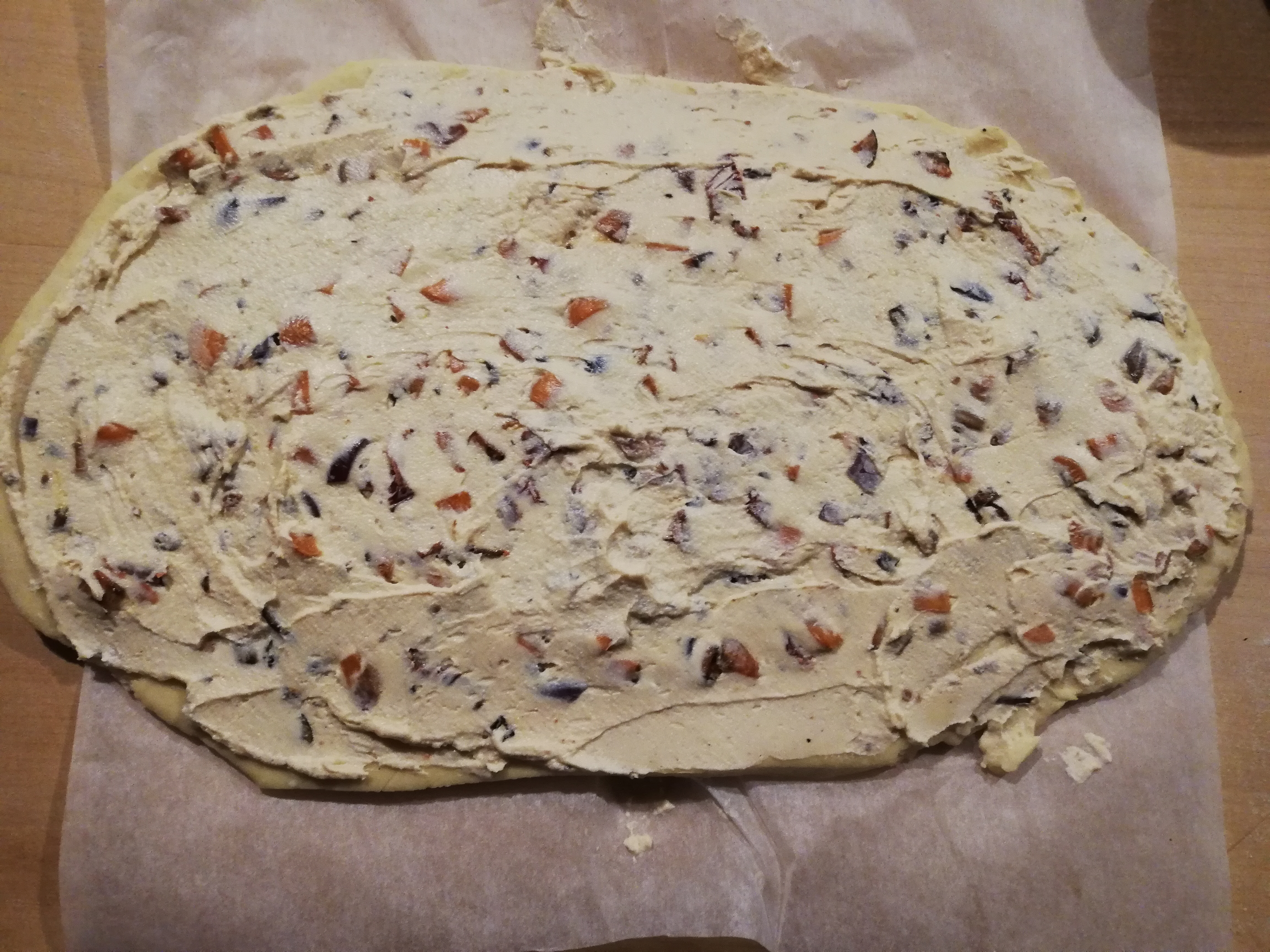 Roll out the dough on a baking sheet to a thickness of about 5 mm =1/4 inch and let it rise covered for at least 15 minutes.