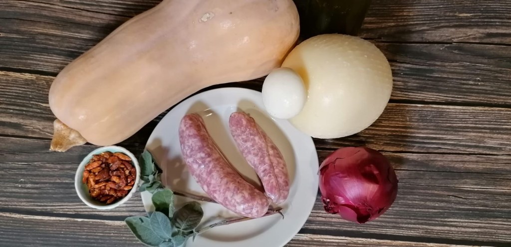 A last-minute pasta sauce with the beautiful seasonal pumpkin, the sausage taste, and the great provola.If vegetarian you just avoid the sausage.
