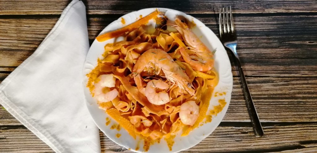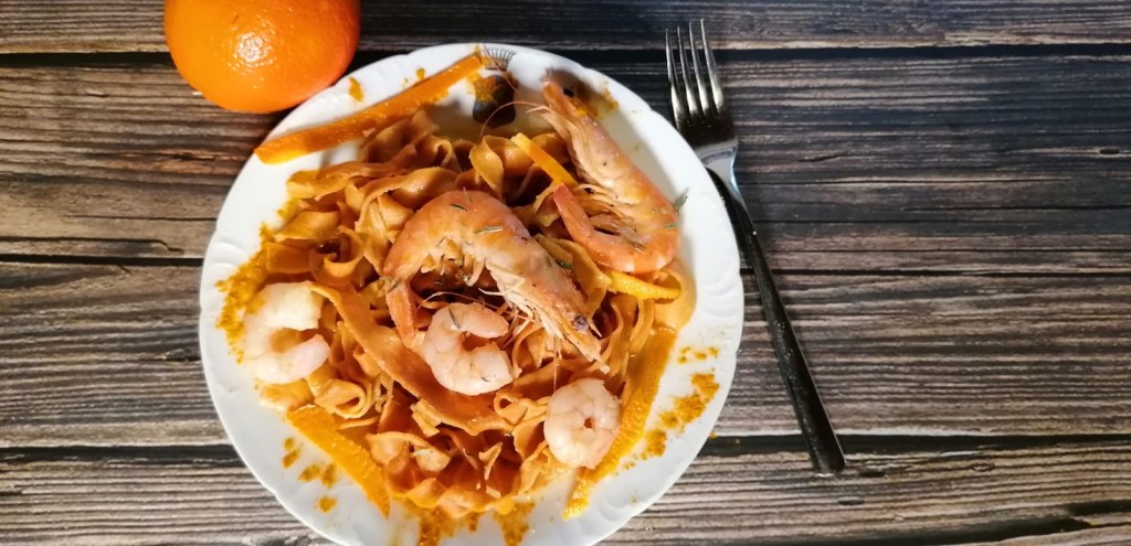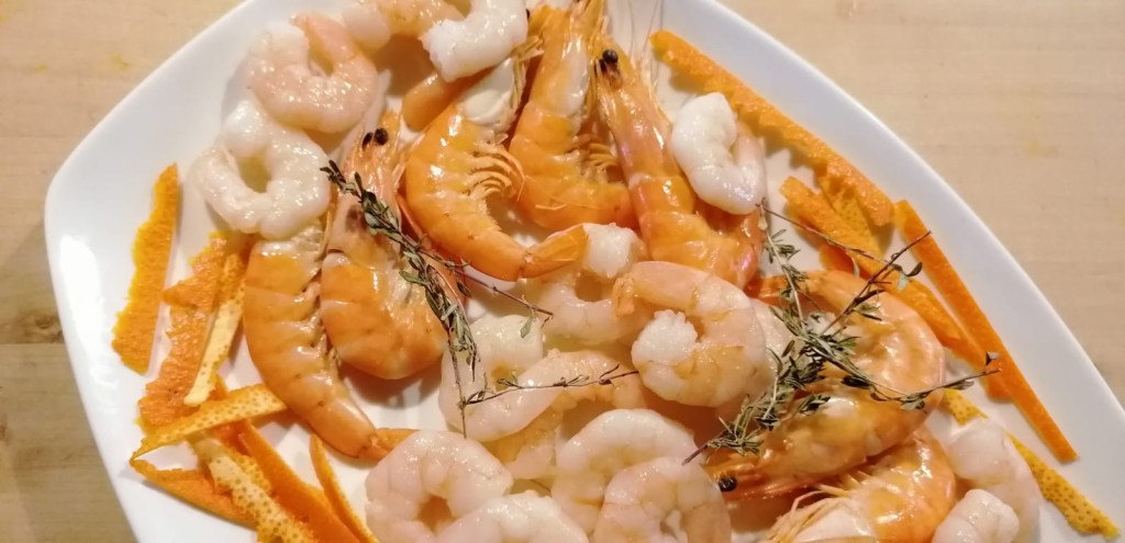In the pan, melt the butter with the thyme. Add the shrimp already cleaned and brown them for a few moments. Deglaze with orange juice.