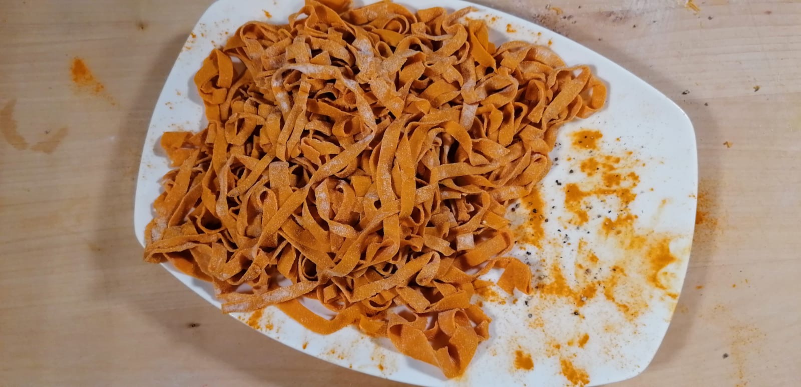 Pull the dough, let it dry a few moments in the air, and cut out the tagliolini.