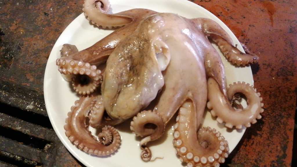 Once it comes to a boil, take the octopus by the head, immerse the tentacles in boiling water a few seconds then bring the octopus up again