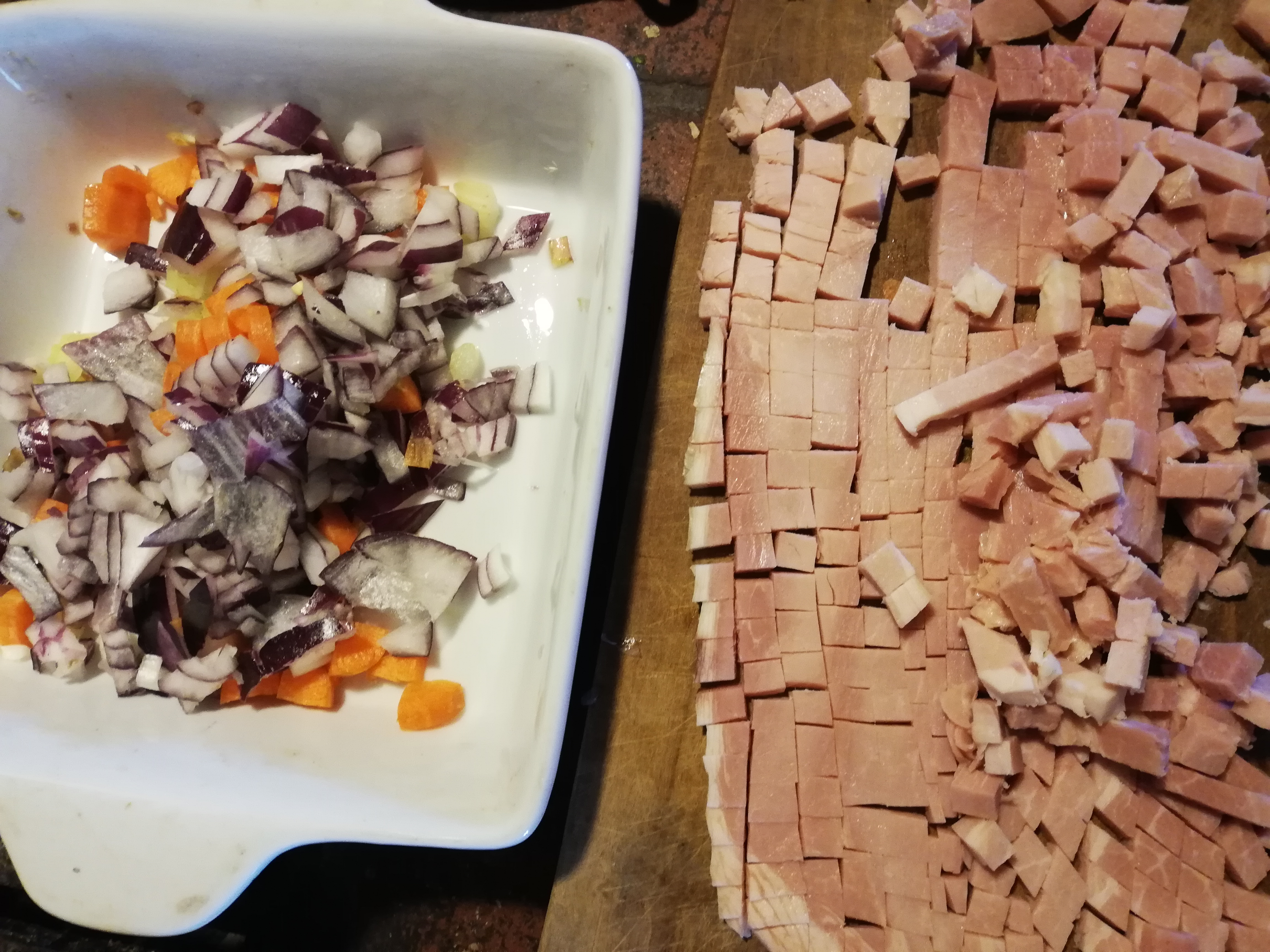 a thick slice of cooked ham,1 small onion,1 small carrot,