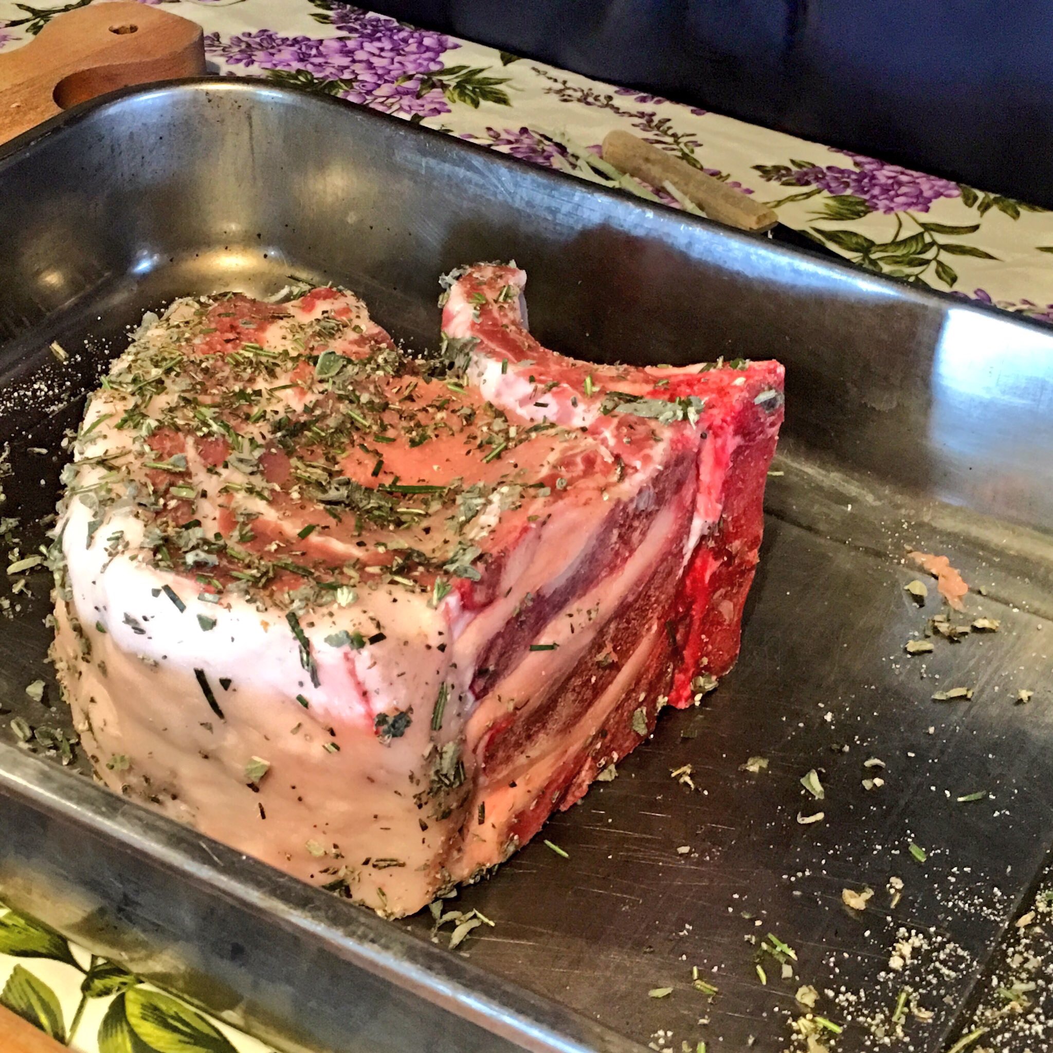 - In a oven dish pour on 2 tbs. olive oil, the chopped herbs, salt and pepper.