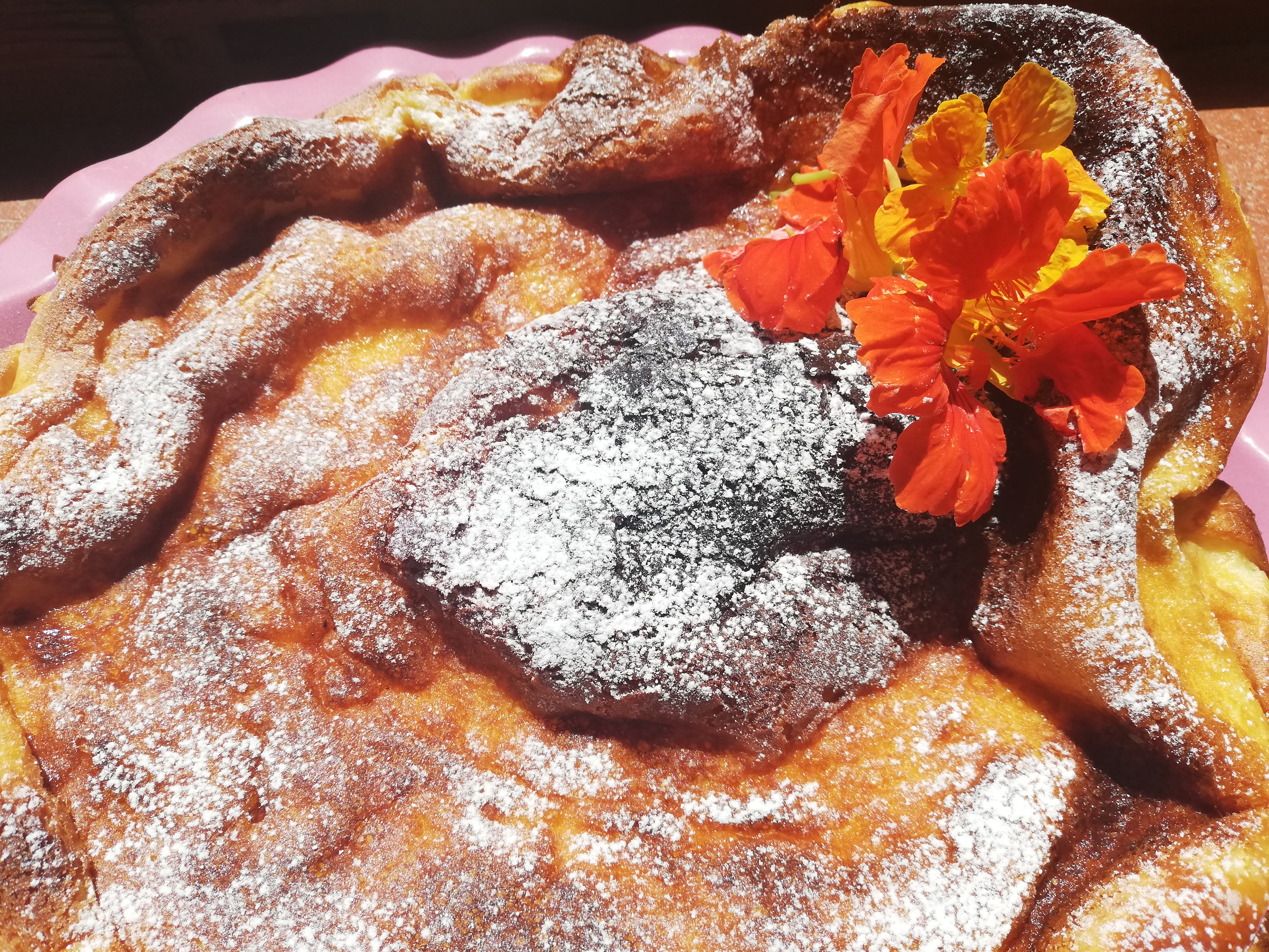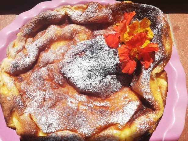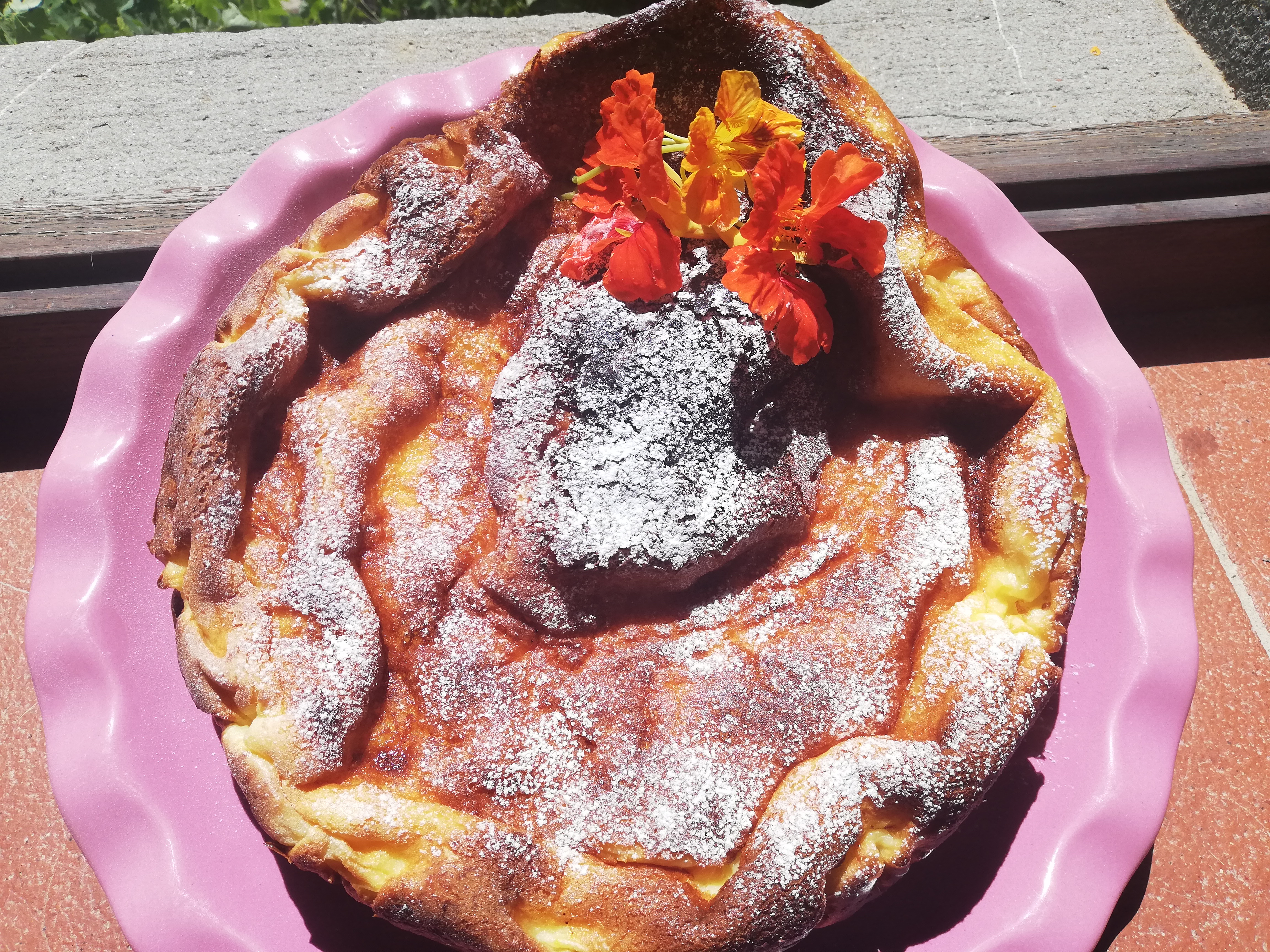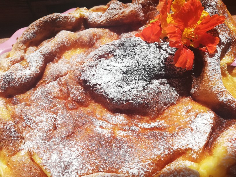 One thing I like about this cake is that every time the surface is different. Let me explain better, it will depend on the oven where you cook, the way to mix the eggs, in cooking it swells and makes bubbles. When we bring it out of the oven the bubbles sag and make form drawings. Time ago this would have been seen as negative but if you think about it it is much more beautiful and gives space to your creativity. This time I chose to decorate it with edible flowers of the nasturtium.