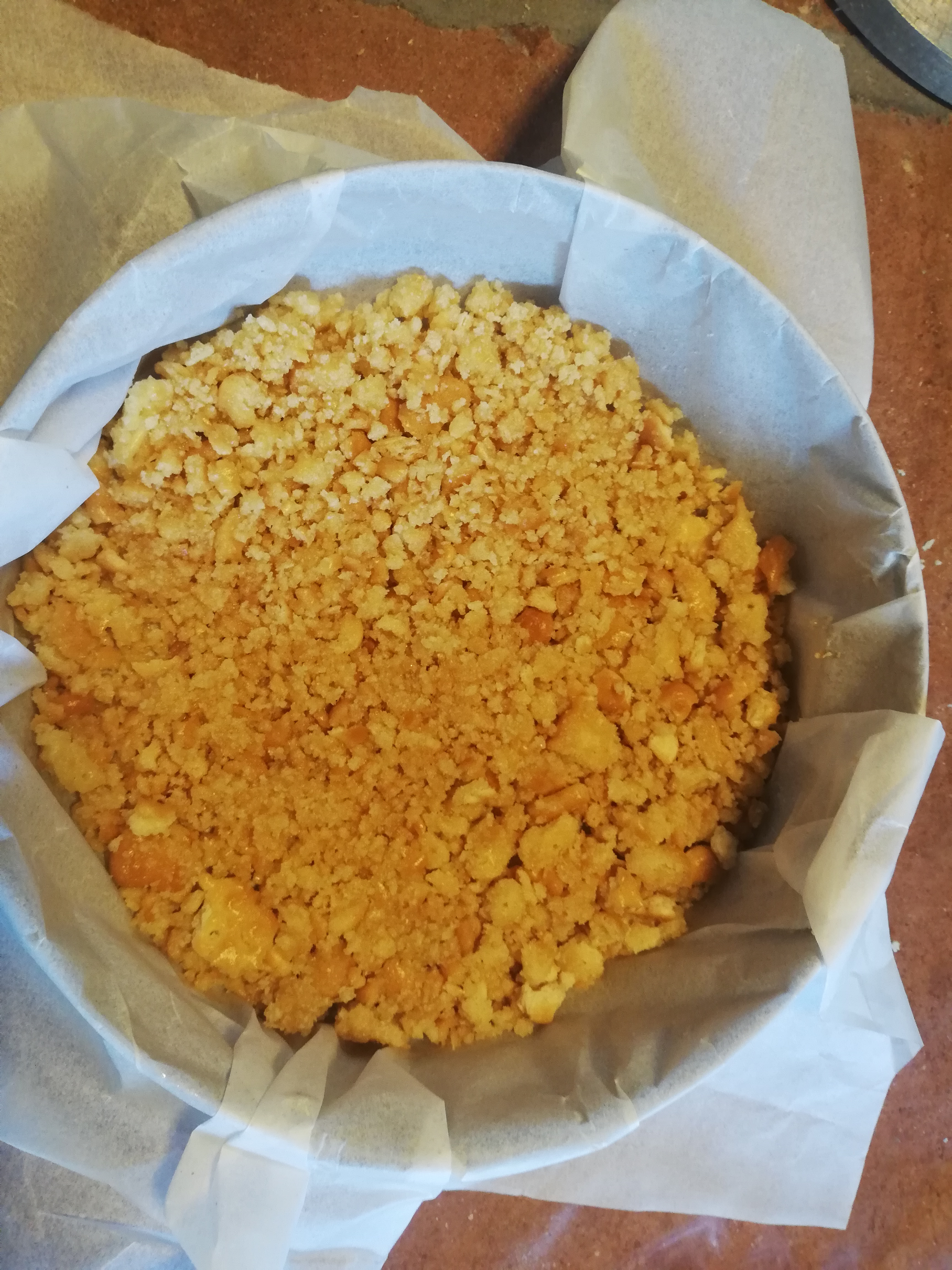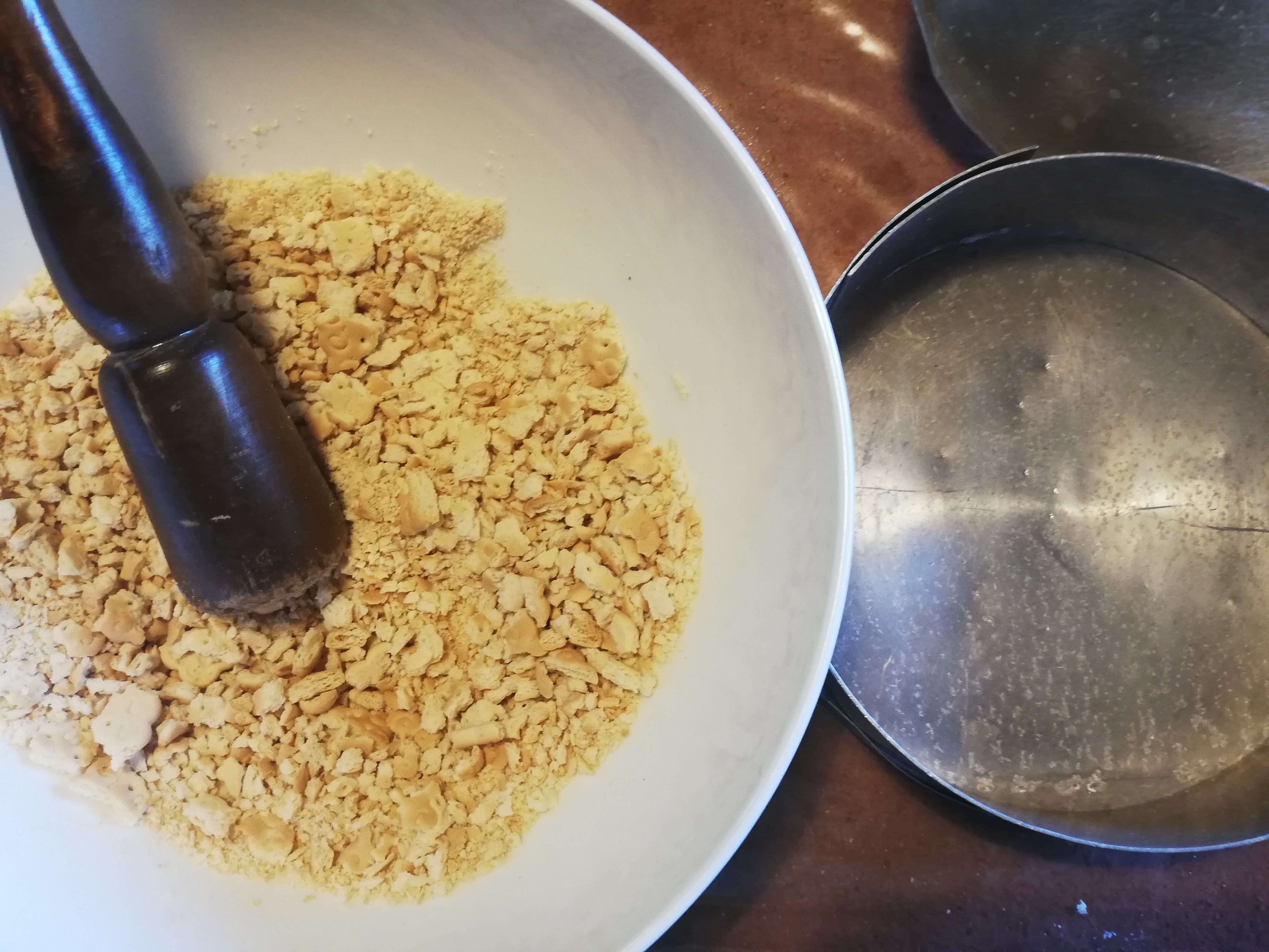 Crush well the dry cookies/biscuits you have chosen, and mix with melted butter.