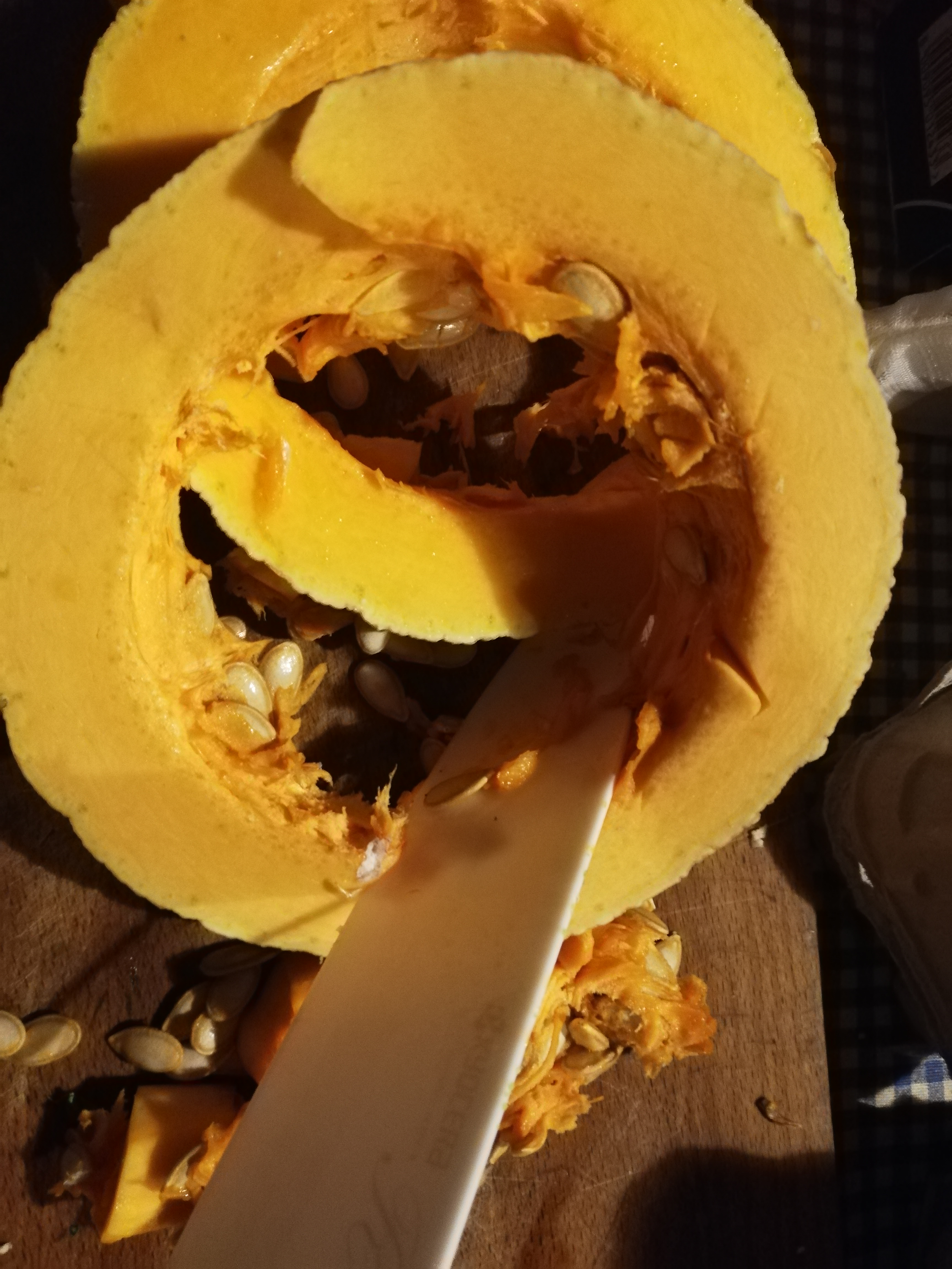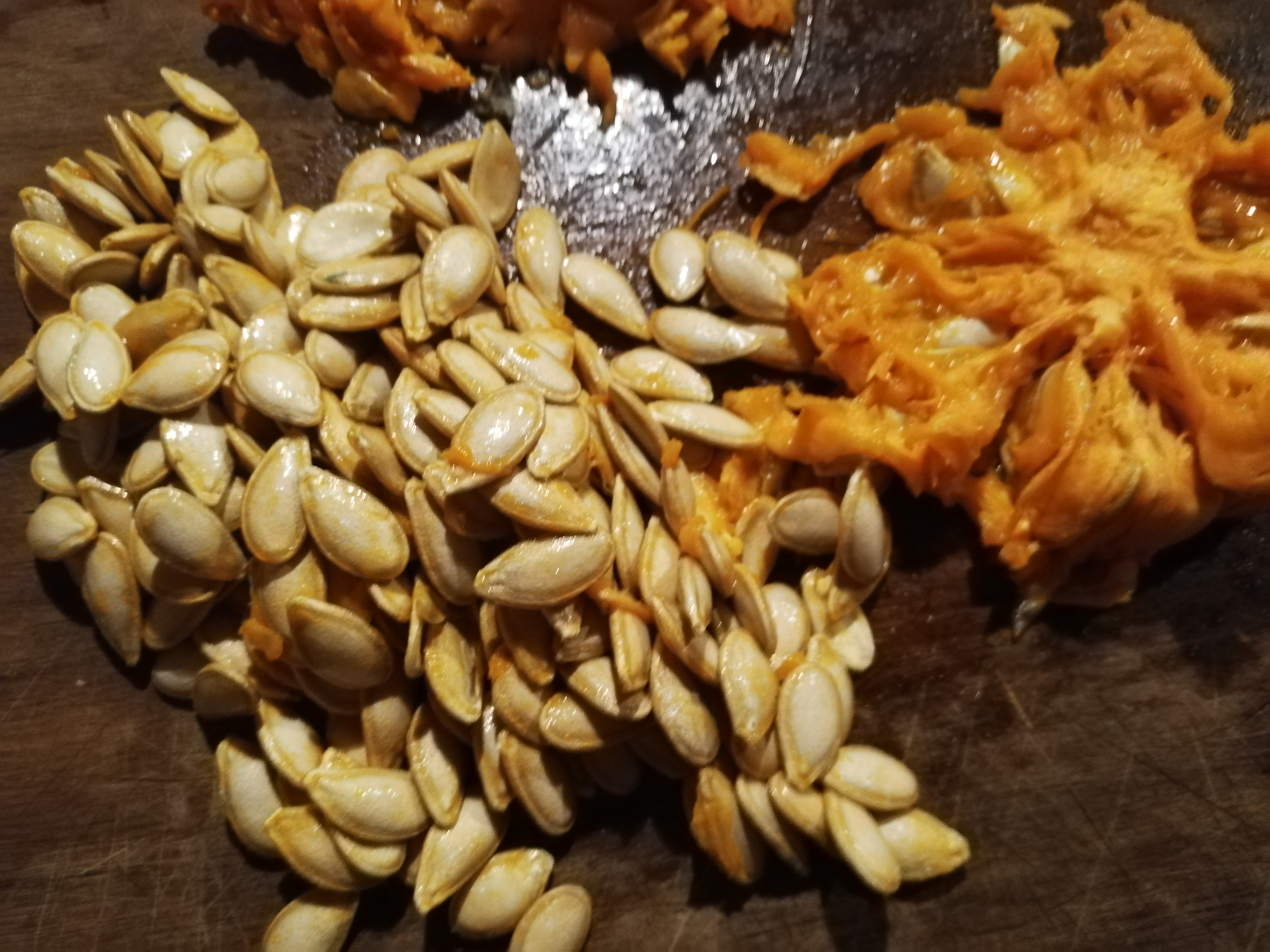 Clean the inside of the pumpkin. It is enough to press a little on the seeds with a knife and they come off the filaments of the pumpkin. Clean them by removing all filaments.