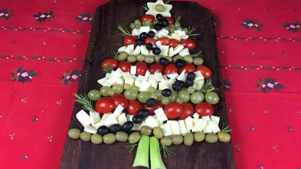 On a cutting board or tray arrange the shape of the Christmas tree and begin to arrange the piece of celery vertically centrally as trunk and green olives horizontally as the beginning of the tree.
