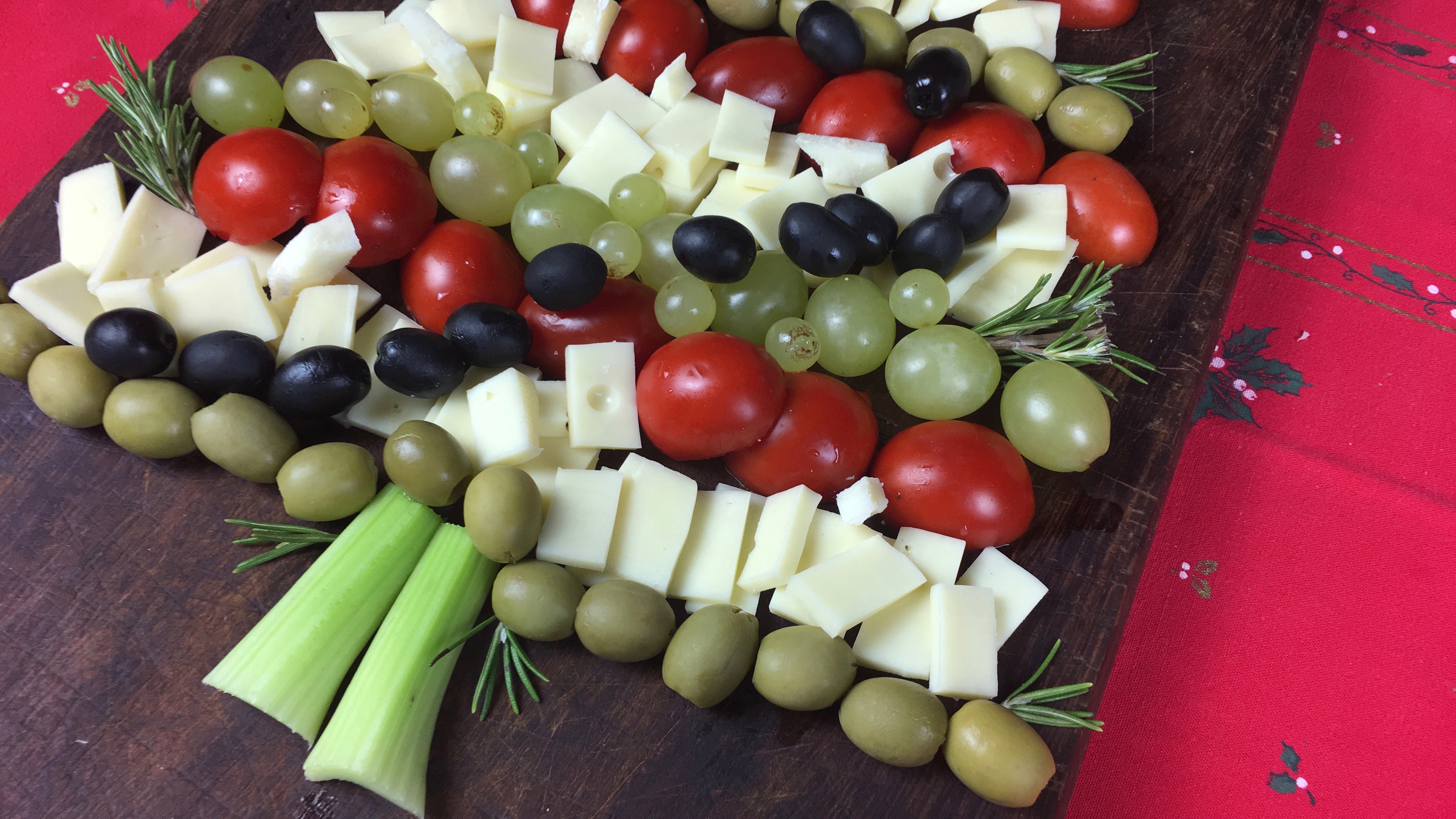On a cutting board or tray arrange the shape of the Christmas tree and begin to arrange the piece of celery vertically centrally as trunk and green olives horizontally as the beginning of the tree.