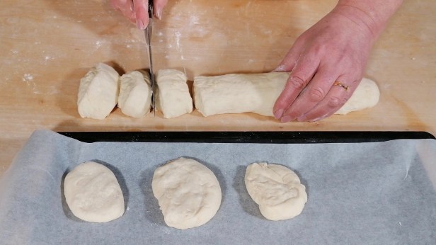 6. With the dough well leavened form a roll, divide it into 12 or 20 equal pieces and push each piece on the floured table obtaining small focaccias.