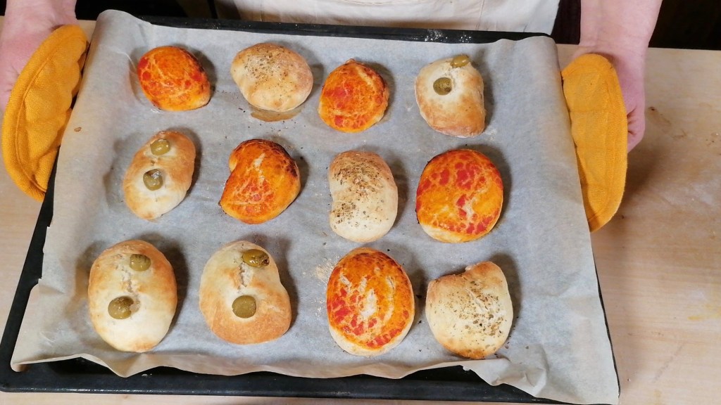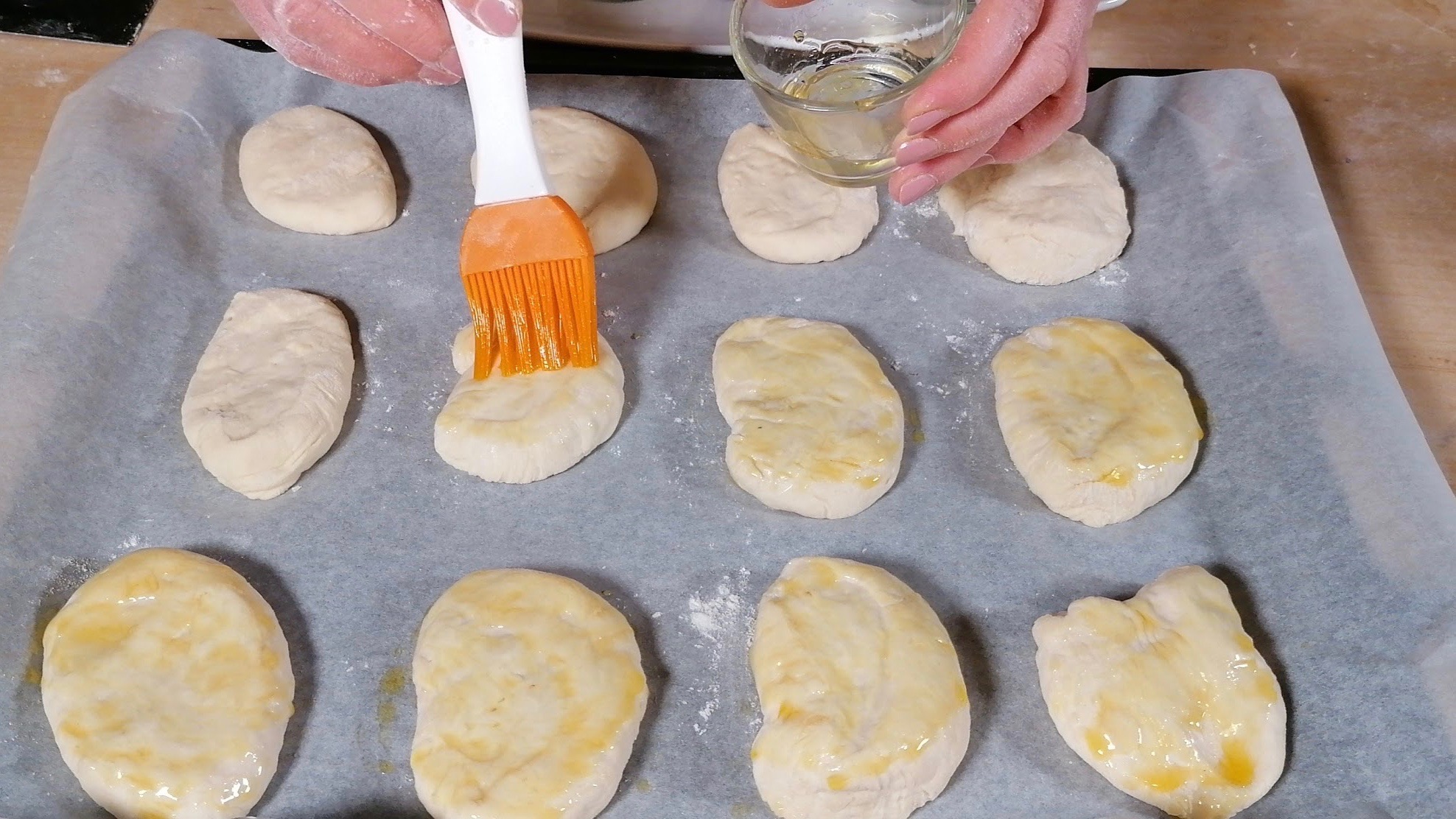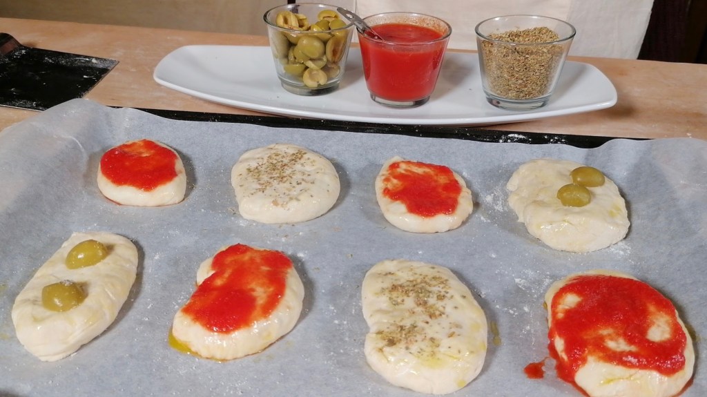 9. Place the focaccias on the oven tray lined with parchment paper, brush over the water and oil, 10.Sprinkle oregano or whatever to taste.