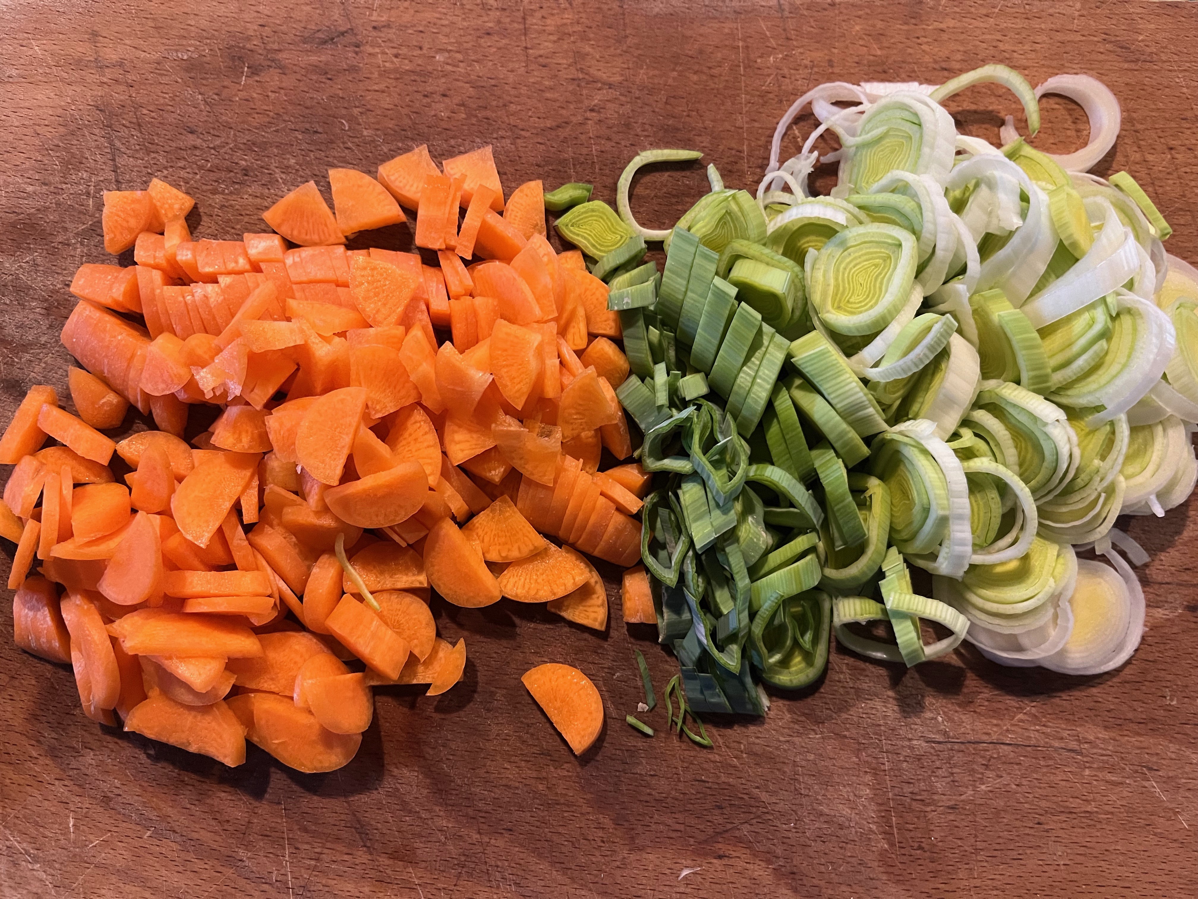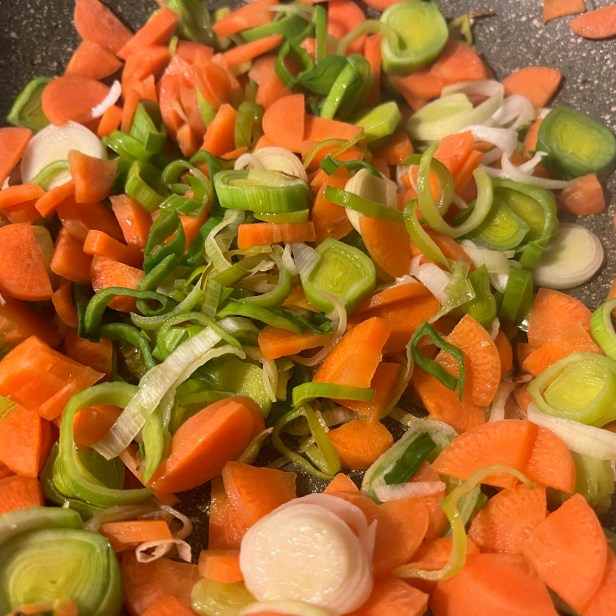Pour 2 tbsp. of oil in a pan, and fry the carrot and leek until they become soft