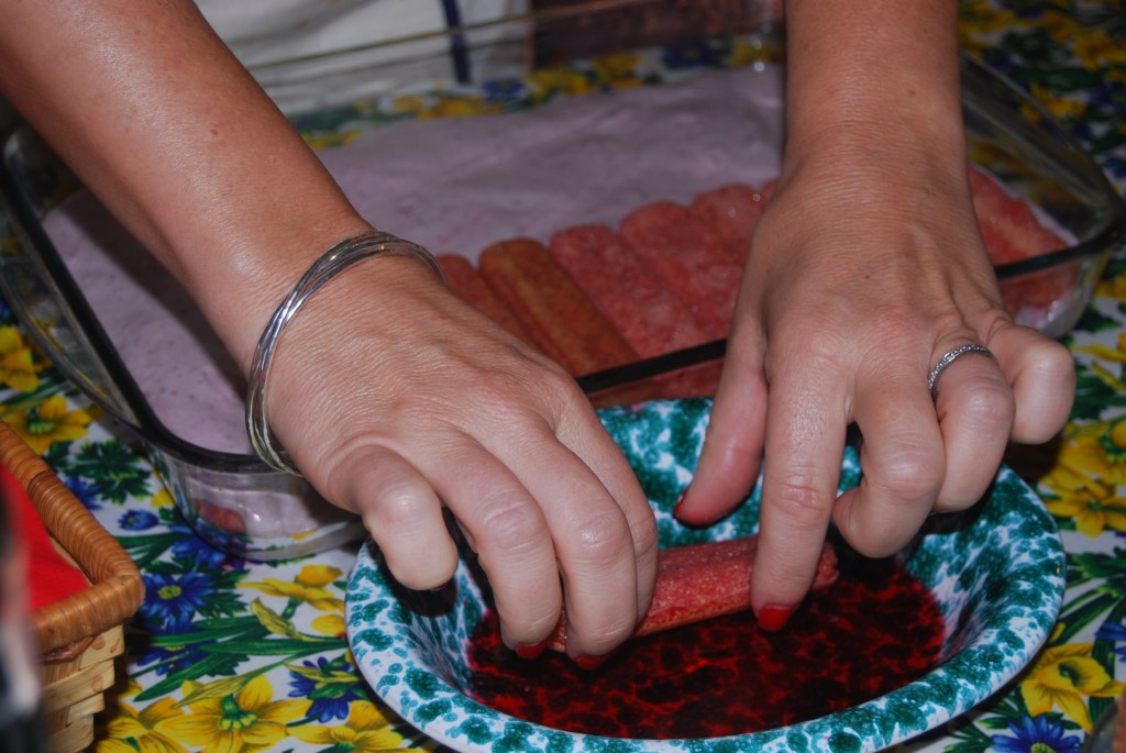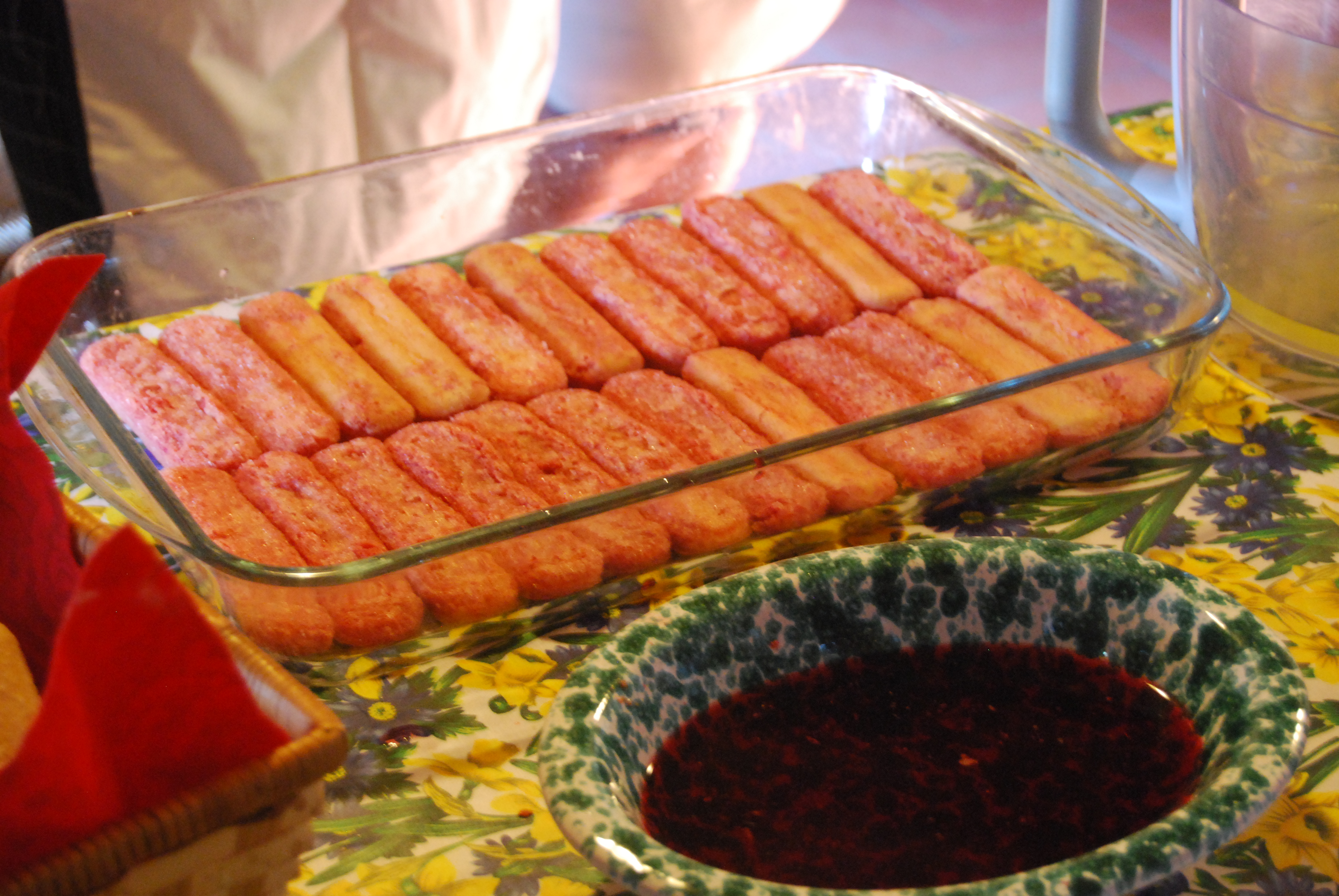 - Dip the sponge fingers one at a time in the alkermes and place a layer of these in a dish.