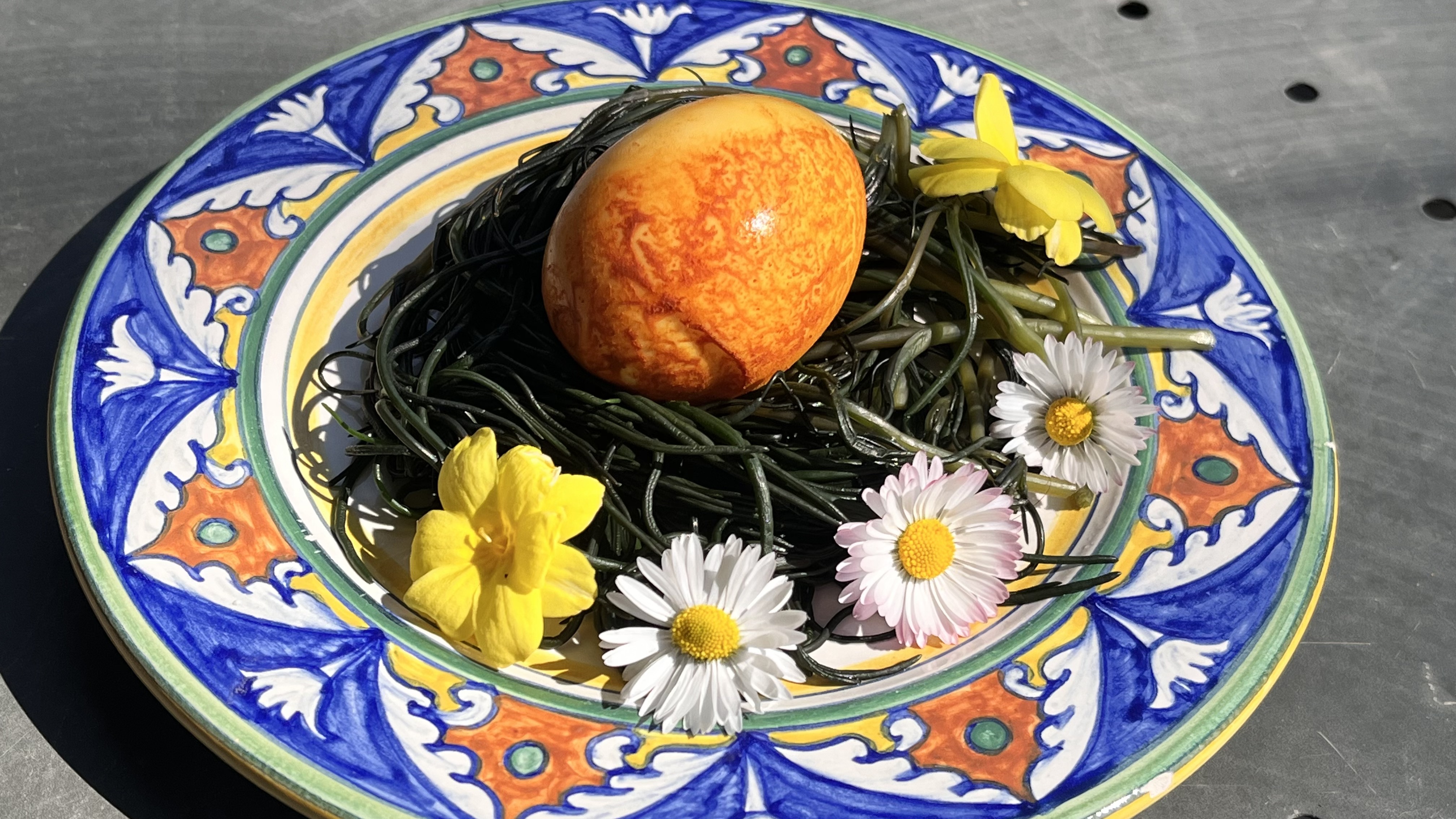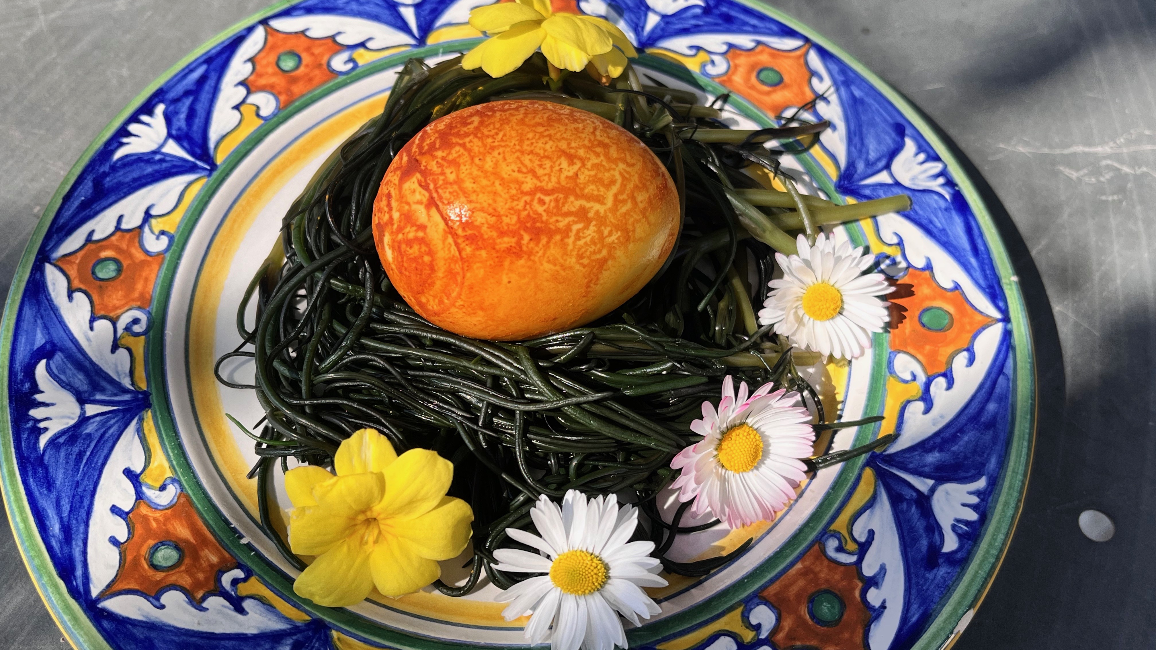 3. Create nests directly in the serving dish, lay the boiled egg in the center, decorate with edible flowers
