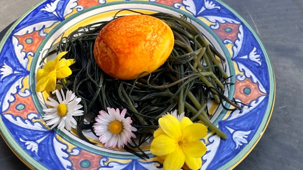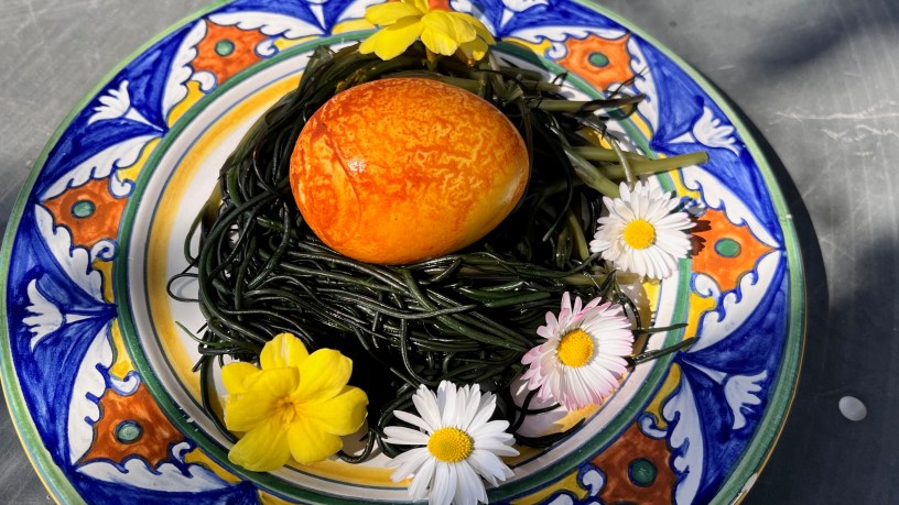 The nest of agretti with colored boiled egg is a nice appetizer to brighten the Easter table in an extremely healthy way