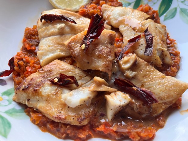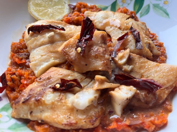 . Brown the peeled garlic in a pan with a drizzle of hot oil; as soon as it begins to brown, remove the garlic and cook the fillets for about 2 minutes on each side. Add salt and pepper Add the lemon juice and cook for 10 minutes. Divide the pepper/capsicums sauce into bowls and add the cod fillets. Garnish with the lemon slices and peperone crusco