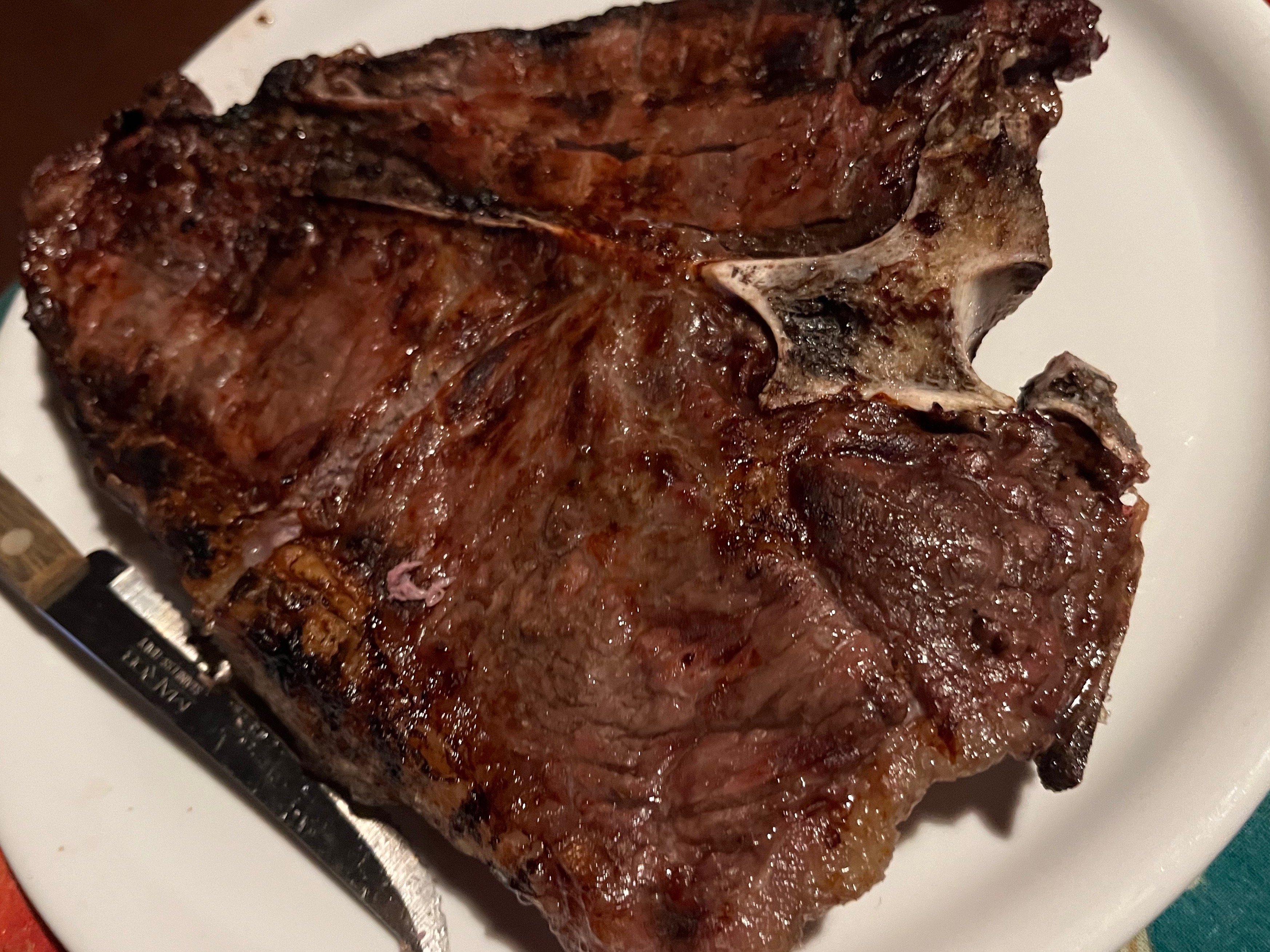 Once cut, the steak has the classic T-shape. The bistecca nel filetto will generally be the less high cut and the bistecca nella costola the higher one; in Florence we like to measure our steaks in terms of fingers, and a good steak should be between 3 and 4 fingers high. It may weigh anything between 800g /1.76 pounds and 1.2kg./2.6 pounds.