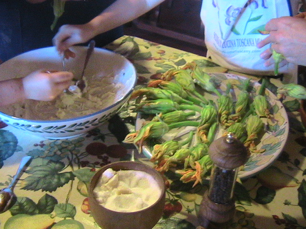 Season with salt and pepper. Fill the zucchini flower with a little of the mixture.