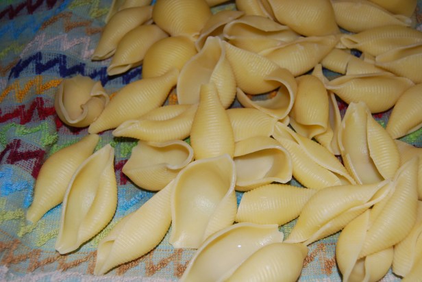 In the meantime, boil the conchiglioni drain them when they are very al dente. Place them on a tray to cool
