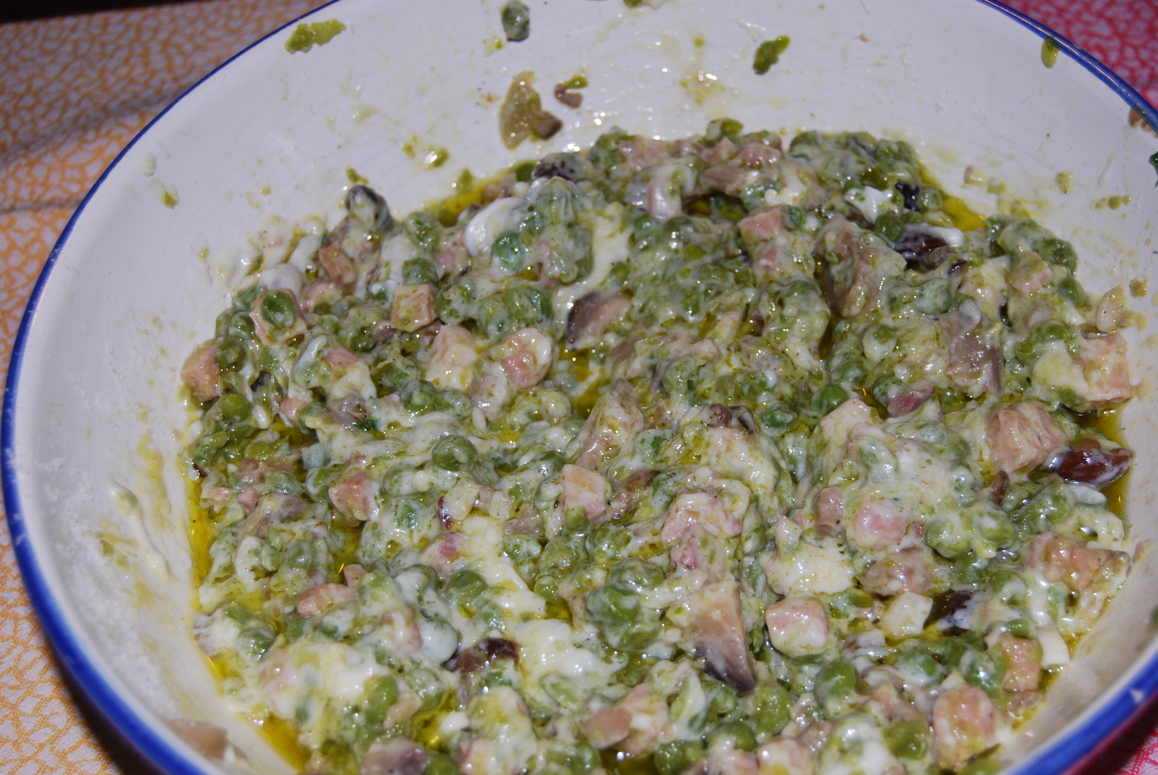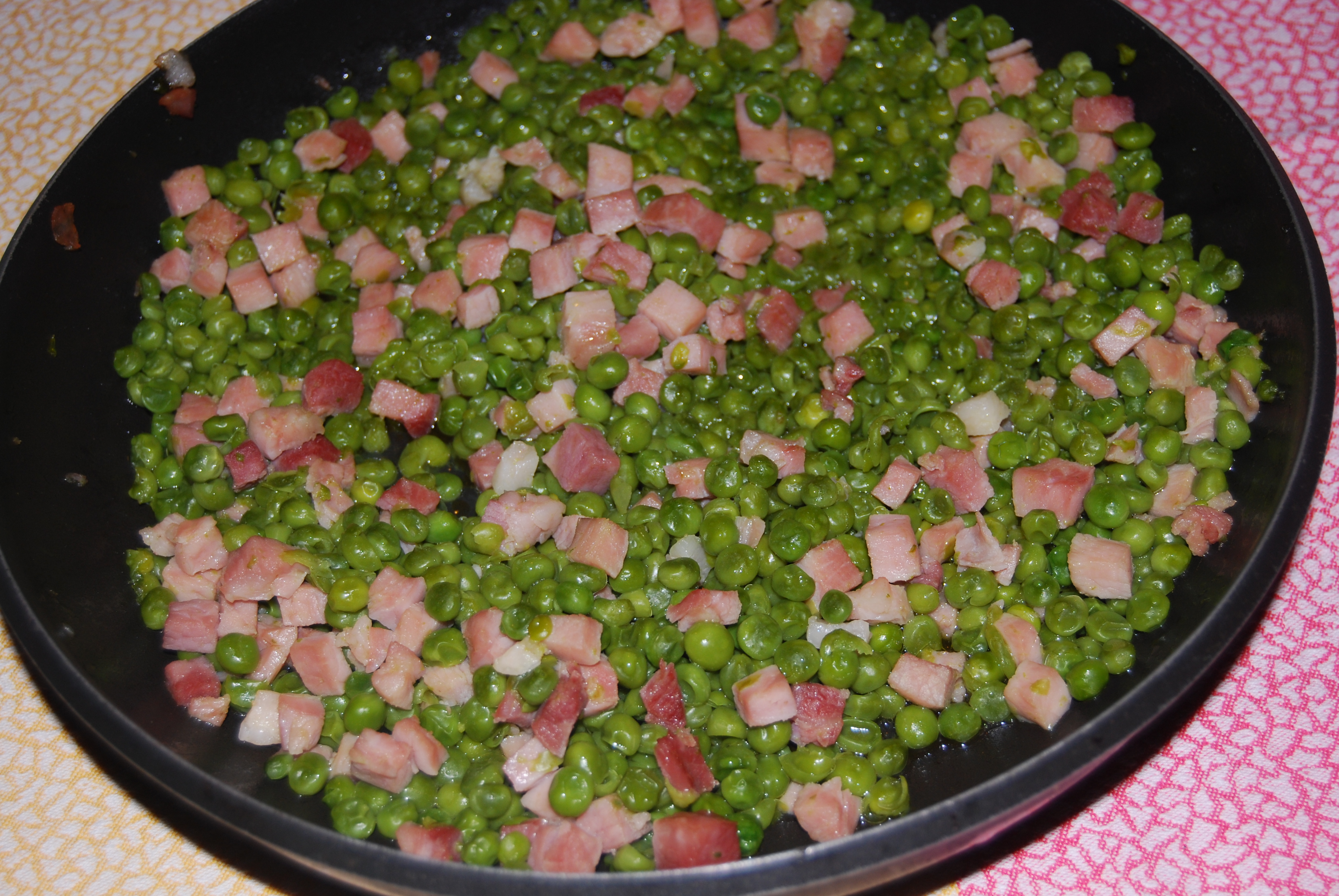 In another pan, sauté the ham cubes with the peas and two tablespoons of oil until the peas are tender.