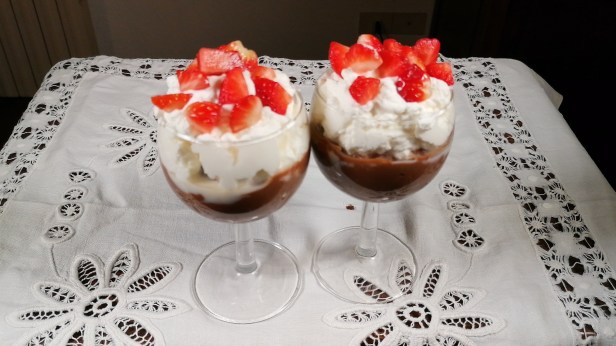 10. Place a little chopped strawberries on the base of the glasses or bowls,chocolate cream ,whipped cream and decorate with strawberries.