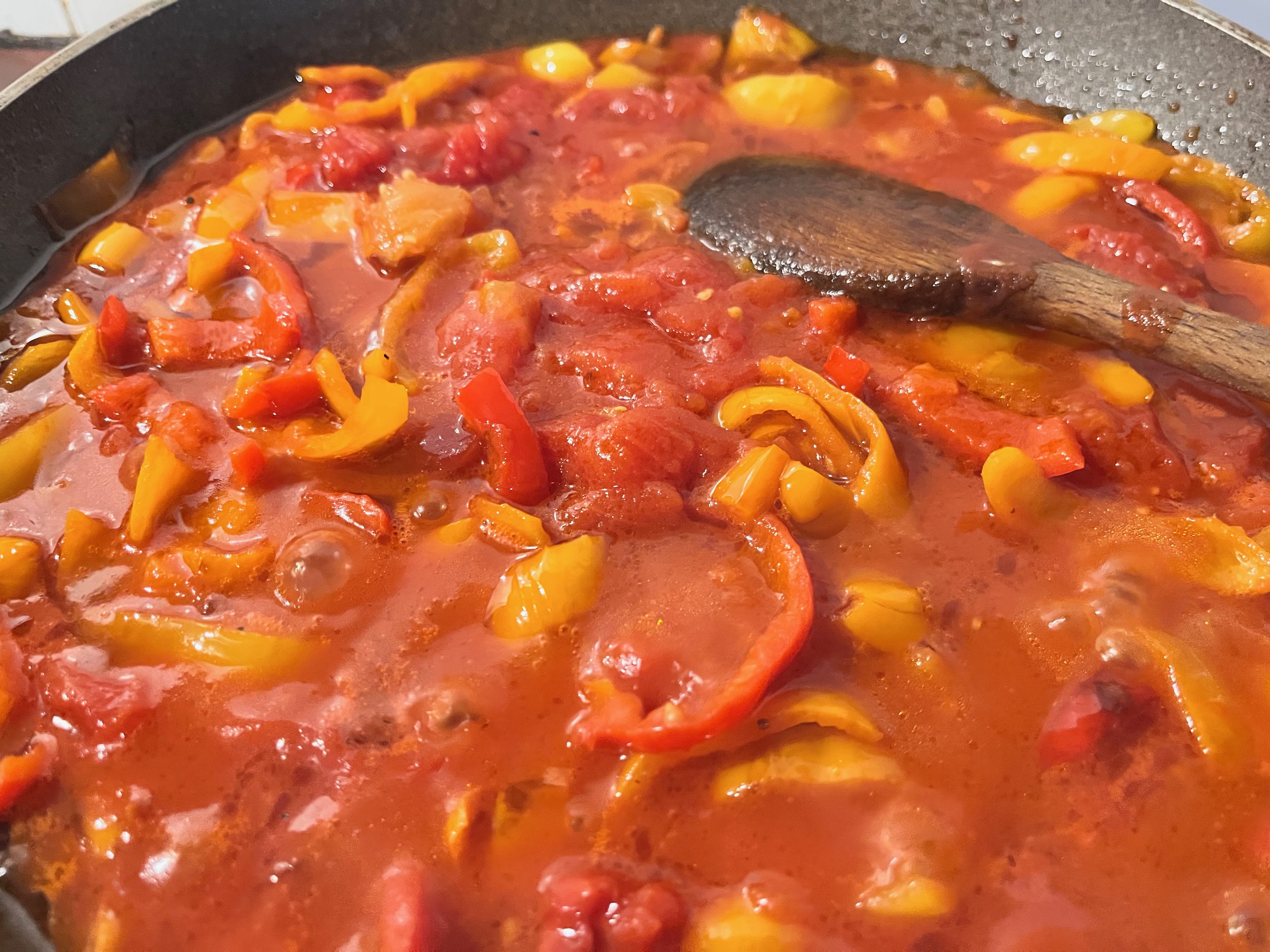 Remove the peppers from the pan and add the tomatoes to the pan; salt, pepper and cook for 10 minutes