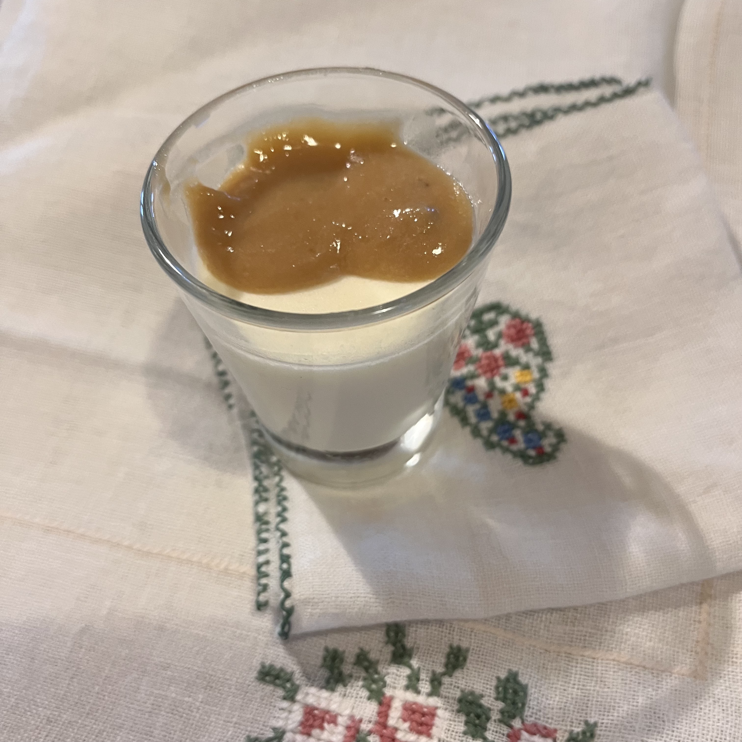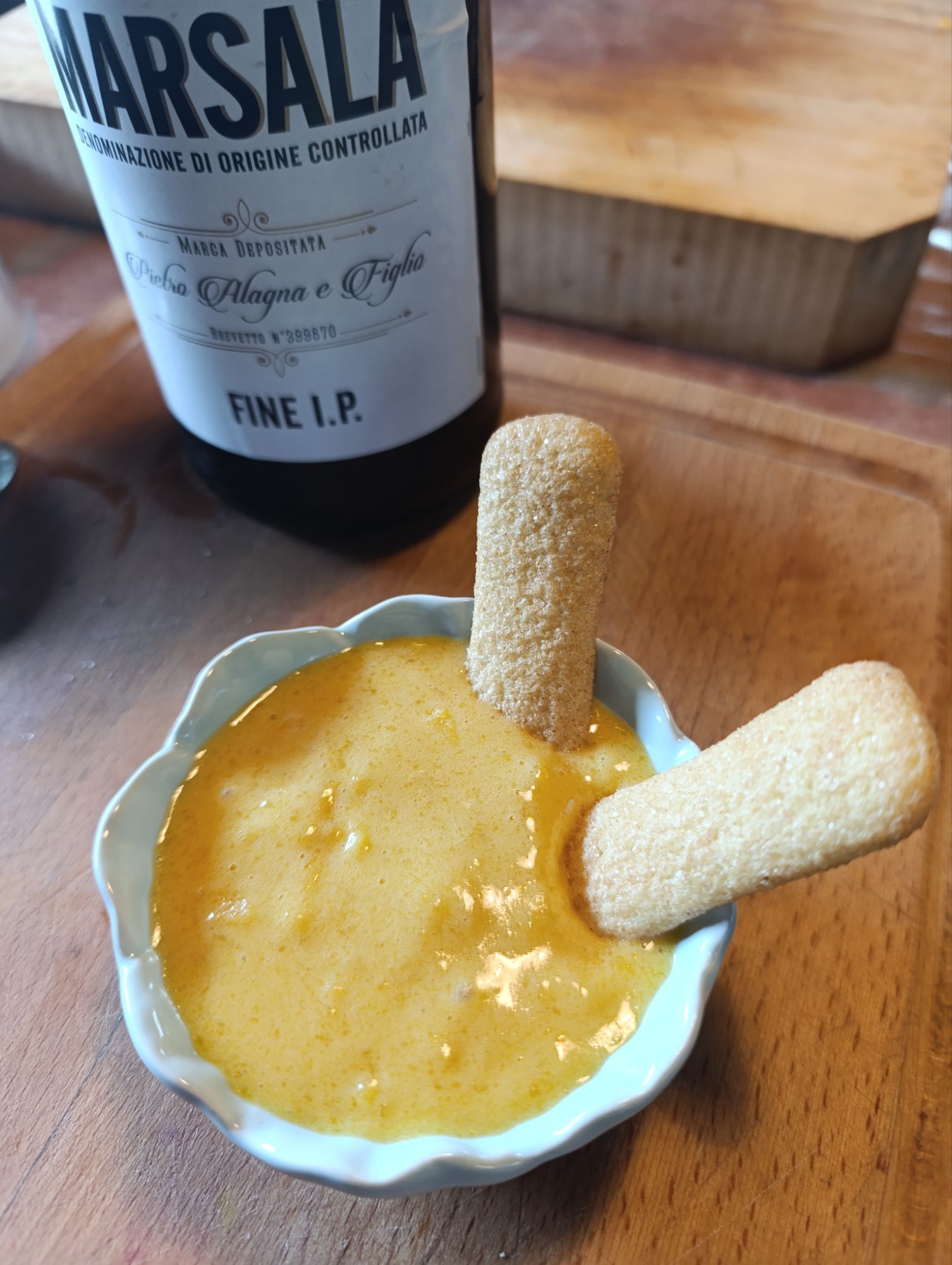 It is not a complex recipe, but it needs care and attention, cooked in a bain-marie it must be whipped continuously until it reaches a soft and frothy consistency. It is often accompanied by a slice of cake, panettone at Christmas but it is not unusual to find it in a cup with a couple of lingue di gatto, on gelato, on panna cotta or on cooked fruit as in this variant with pears cooked in wine.