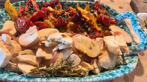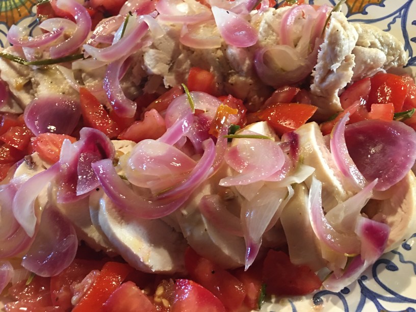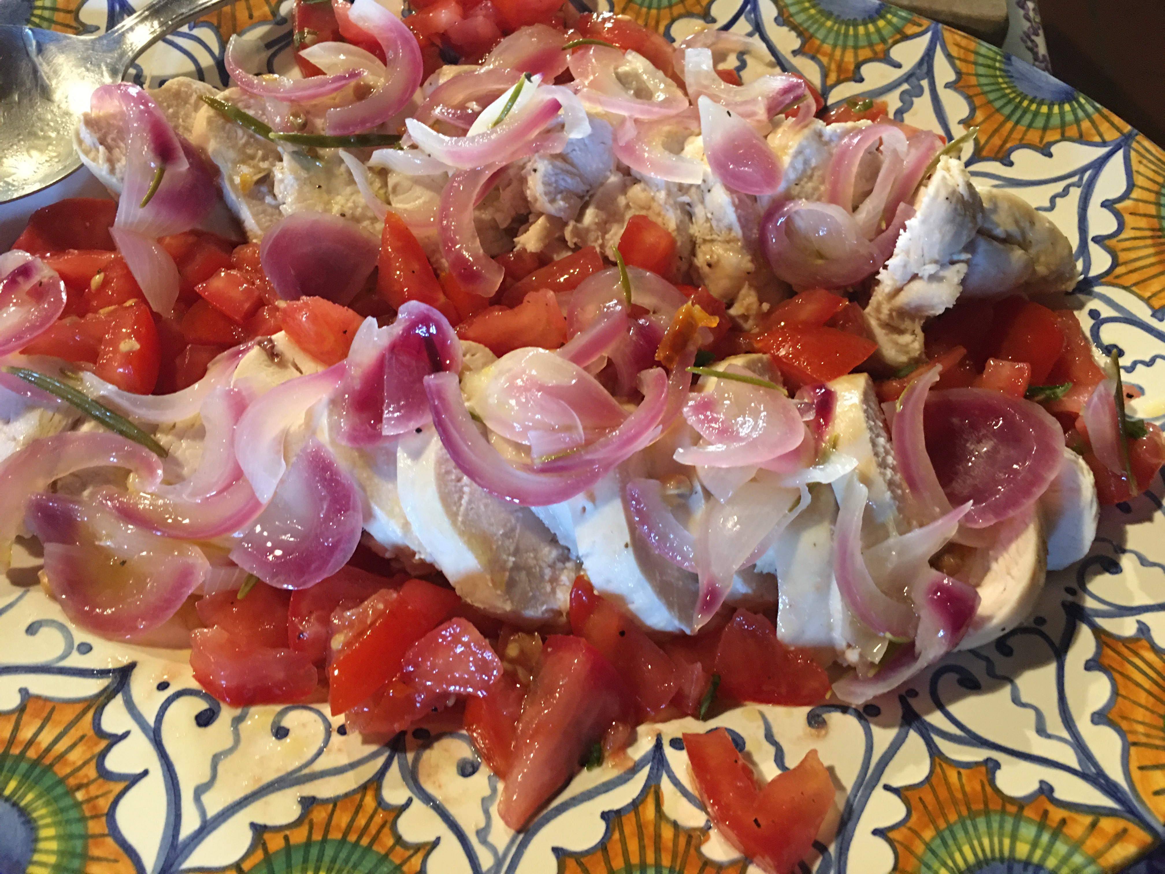 This chicken may be served with roasted bell peppers, fresh tomatoes,potatoes, zucchini