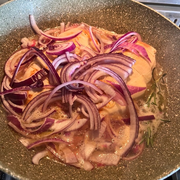 - Cut the shallot into thin slices, after having peeled it, and add it to the chicken, with a pinch of salt.