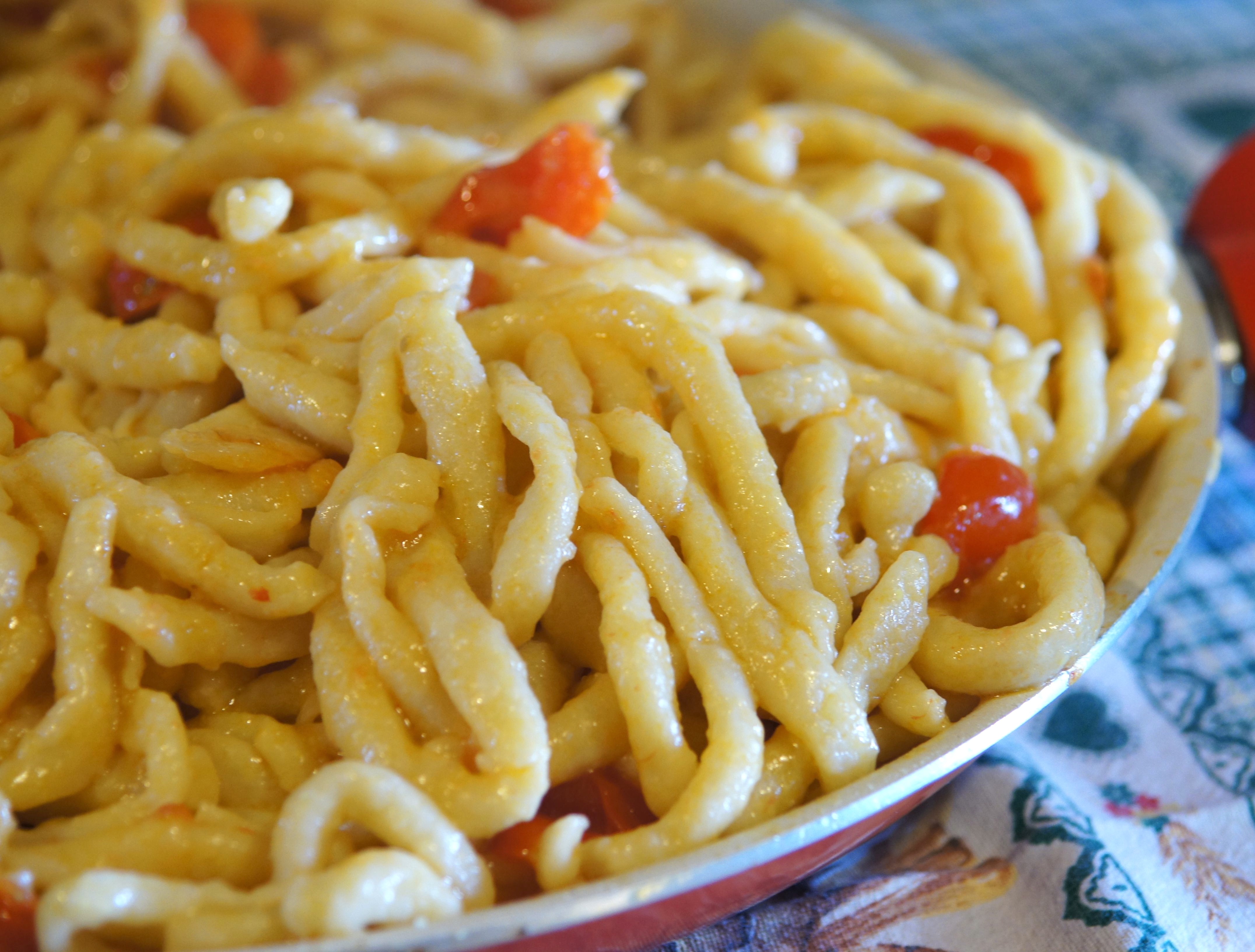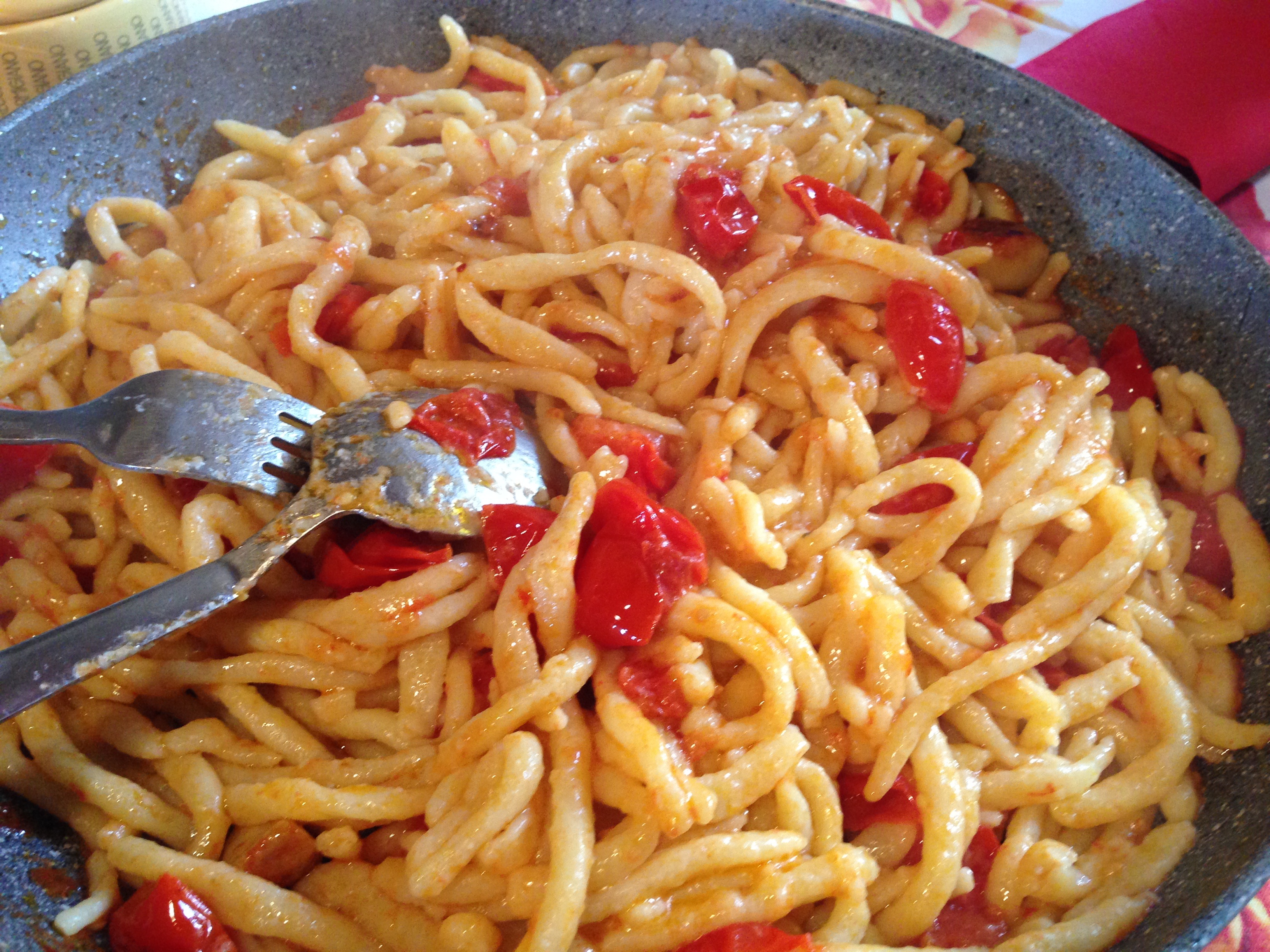 The best known sauce pici are served with is “all’aglione,(big garlic)” a thick sauce made with tomato, oil, garlic, and chili pepper. Then the sauce is generally made with breadcrumbs, made from stale bread sautéed in oil, garlic, and chili pepper.