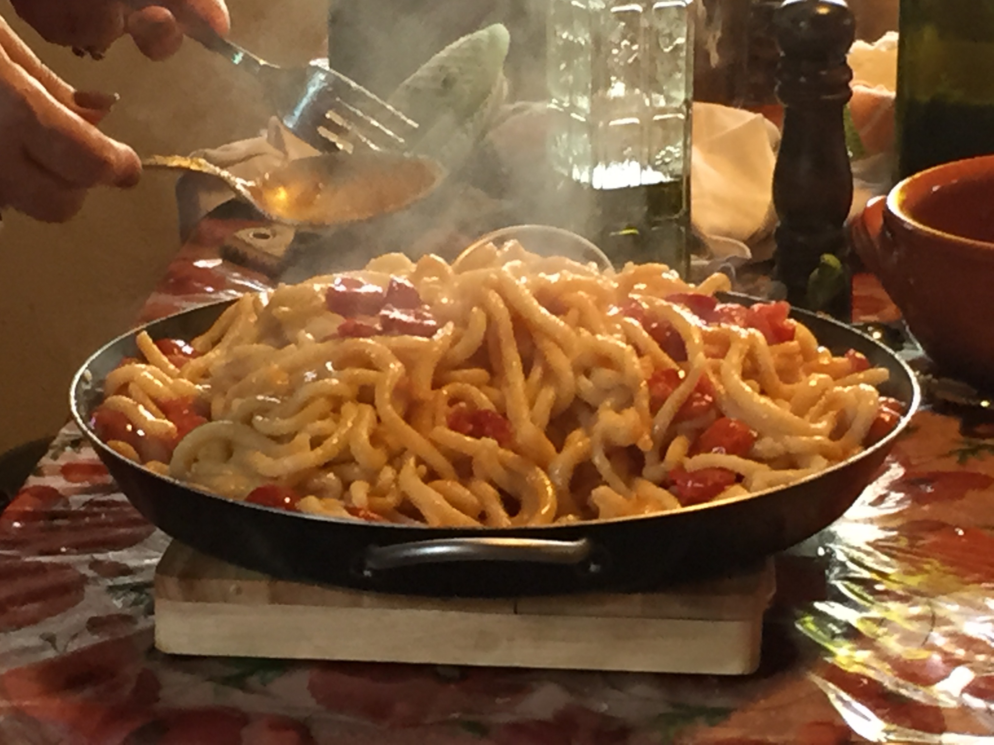 In other places pici are served with “sugo bianco di nana” (white duck sauce) ,with meat sauce or topped with cacio e pepe (cheese and pepper). In Montalcino, however, the so-called “pinci” were served with a rich ragù of veal, chicken, sausage. In the mountains, pici are topped with fresh mountain mushrooms while at Lake Chiusi, you can enjoy pici with a sauce made from pike roe.